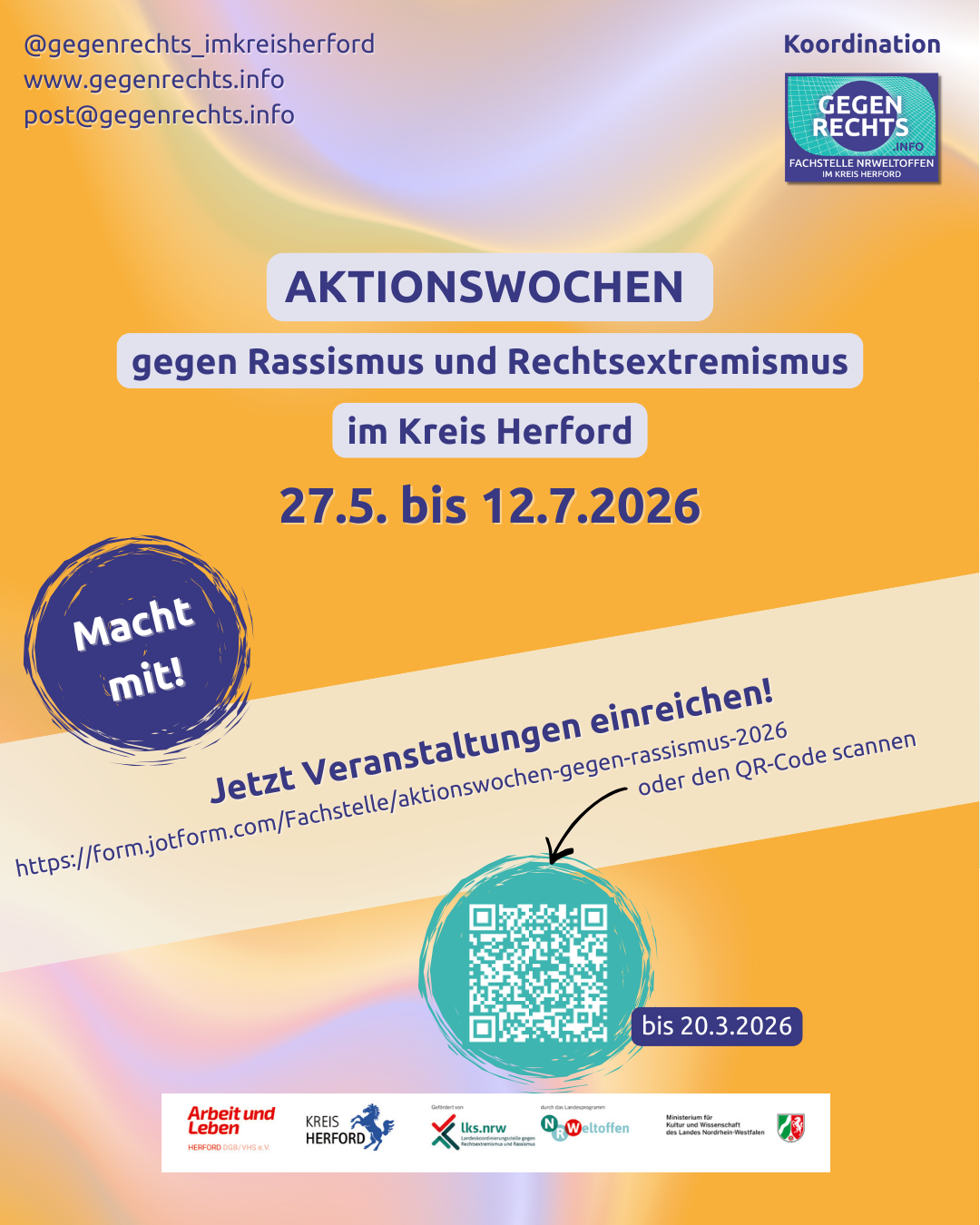 Bitte sprechen Sie, sprecht ihr auch Kolleg*innen und Kooperationspartner*innen an, ob sie Interesse und Ideen haben sich zu beteiligen. Gern sind wir auch für noch vorläufige Ideen ansprechbar und beraten gemeinsam die Umsetzung. Dieser Aufruf kann gern weitergeleitet werden. Die Grafiken können für Instagram verwendet werden. Verlinkungen @gegenrechts_imkreisherford helfen der Reichweite des Anliegens.