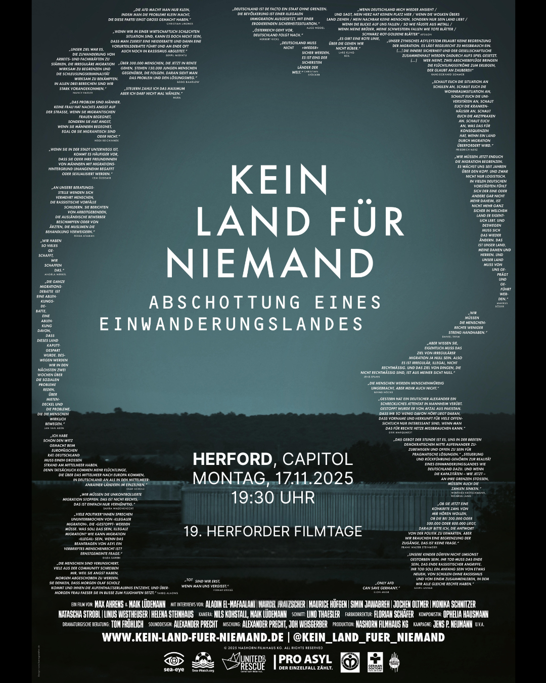 Der 107-minütige Film »Kein Land für Niemand – Abschottung eines Einwanderungslandes« begibt sich auf die Suche nach den Ursachen dieser politischen Zäsur. Die Dokumentation beginnt an den europäischen Außengrenzen, wo eine andauernde humanitäre Katastrophe auf staatliche Ignoranz trifft, aber auch auf ziviles Engagement. Sie begleitet einen Rettungseinsatz auf dem Mittelmeer, dokumentiert die katastrophale Lage aus der Luft und erzählt die Geschichten von Überlebenden, die trotz Gewalt und tödlicher Risiken den Weg nach Deutschland gefunden haben.