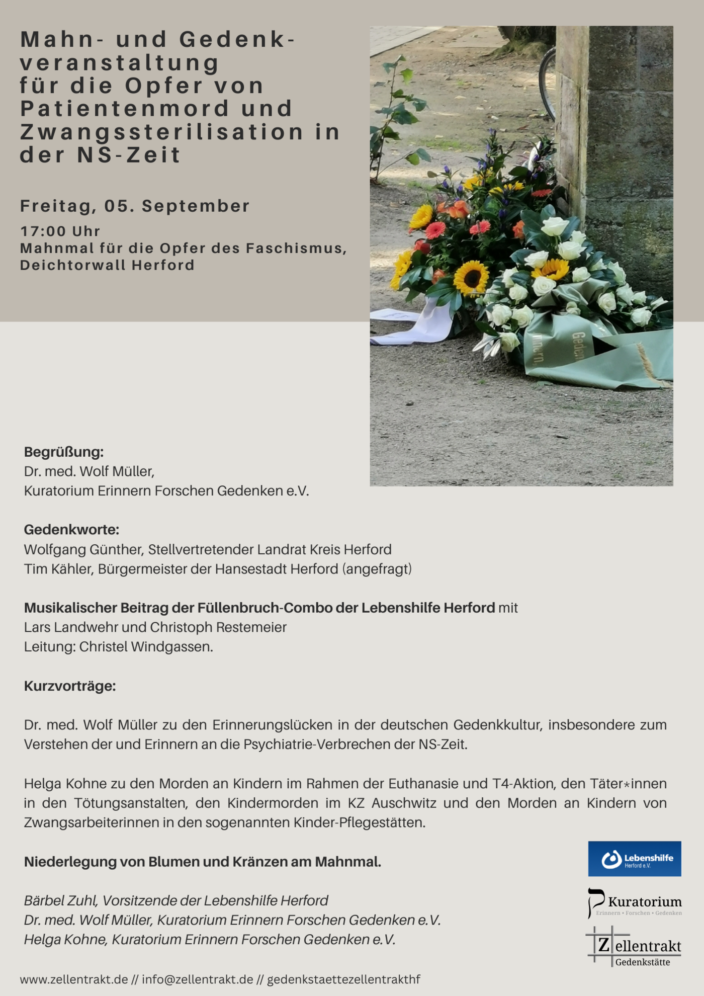 Die Gedenkstätte Zellentrakt lädt ein zur Mahn- und Gedenkveranstaltung für die Opfer von Patientenmord und Zwangssterilisation in der NS-Zeit. Am Freitag, den 05. September um 17:00 Uhr treffen wir uns am Mahnmal für die Opfer des Faschismus am Deichtorwall Herford. Die Begrüßung übernimmt Dr. med Wolf Müller vom Kuratorium Erinnern Forschen Gedenken e.V. Anschließend wird es ein Gedenkwort des stellvertretenden Landrates Wolfgang Günther geben. Der Bürgermeister der Hansestadt Herford Tim Kähler ist ebenfalls angefragt.
