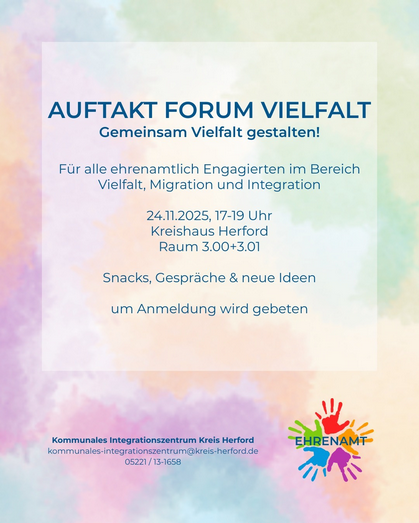 Es wird bis zum 07. November um Anmeldung gebeten. Entweder per Mail (kommunales-integrationszentrum@kreis-herford.de) oder telefonisch (05221 / 13-1658).