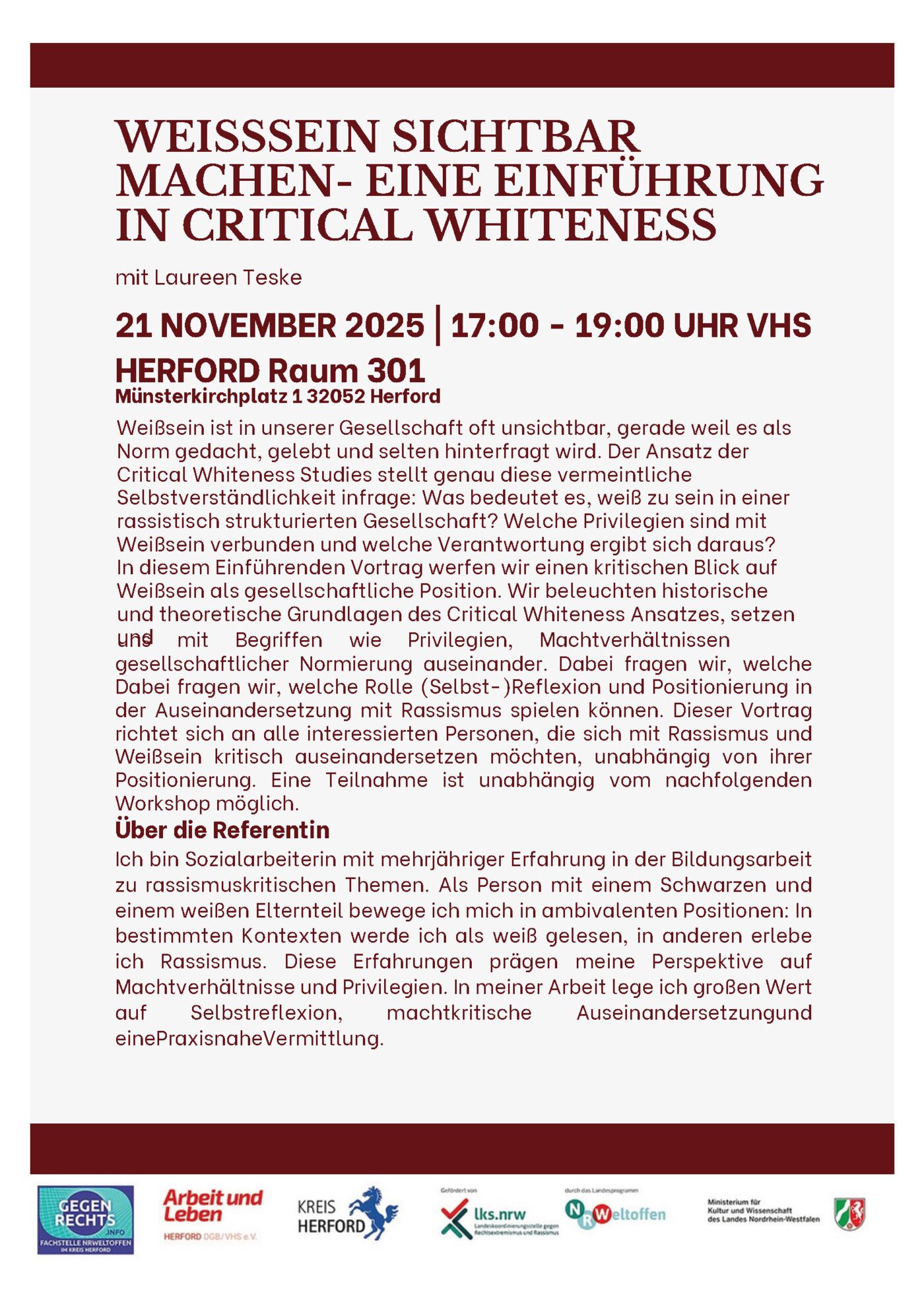 Dieser Vortrag richtet sich an alle interessierten Personen, die sich mit Rassismus und Weißsein kritisch auseinandersetzen möchten, unabhängig von ihrer Positionierung. Eine Teilnahme ist unabhängig vom nachfolgenden Workshop möglich.