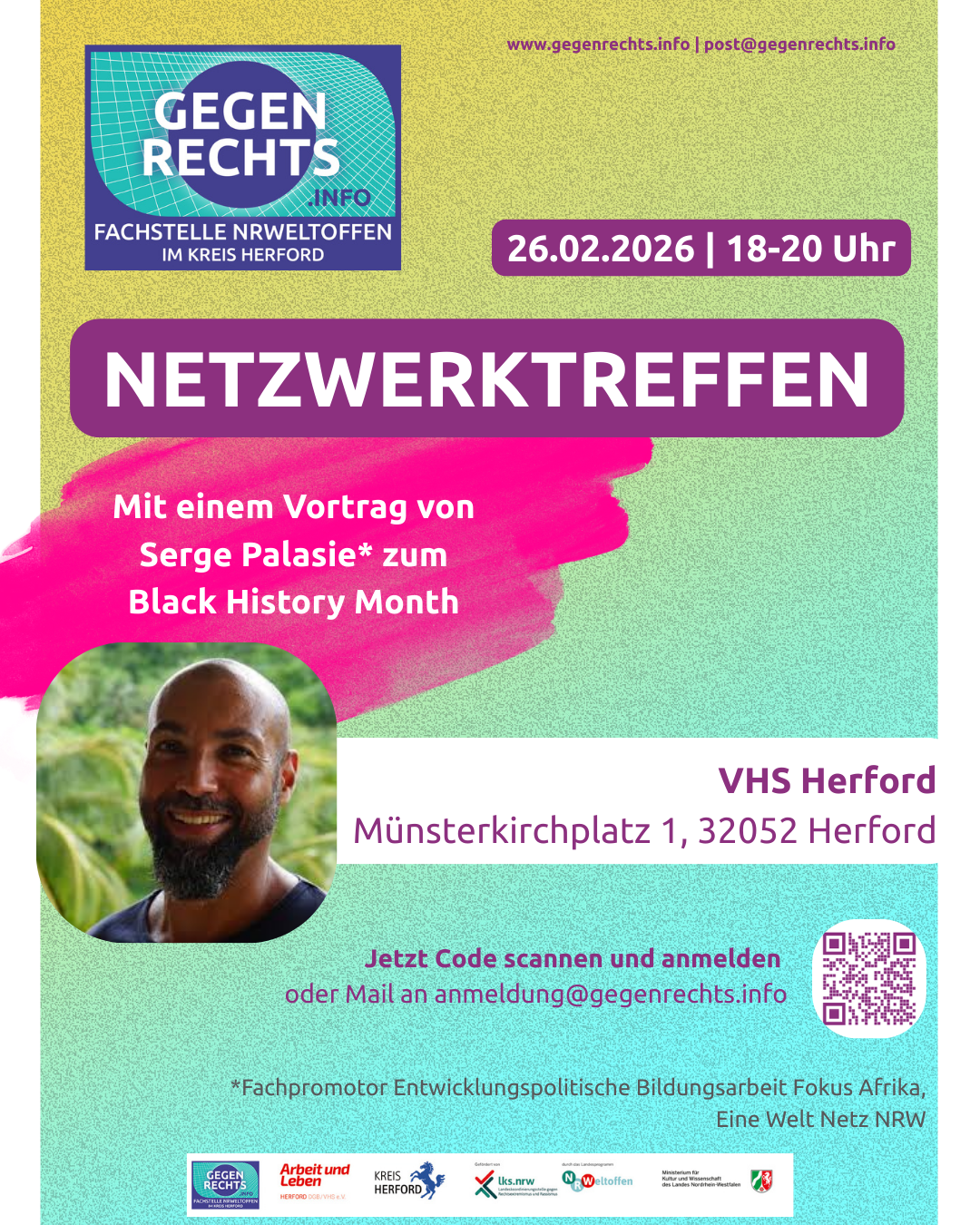 Neben dem Vortrag von Serge Palasie (Fachpromotor Entwicklungspolitische Bildungsarbeit Fokus Afrika, Eine Welt Netz NRW) bietet das kreisweite Netzwerktreffen wieder Raum und Zeit für Austausch und Kennenlernen. Alle Interessierten sind herzlich eingeladen. Anmeldungen für das Netzwerktreffen nehmen wir gern schon per Email entgegen: anmeldung@gegenrechts.info