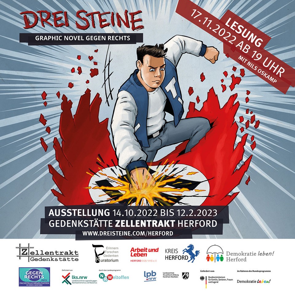 Unter Anleitung des Autors und Künstlers der Graphic Novel „Drei Steine“ Nils Oskamp gestalten Schüler*innen der Gesamtschule Friedenstal und des Elisabeth von der Pfalz-Berufskollegs Tafeln am Zaun der Herforder Synagoge.