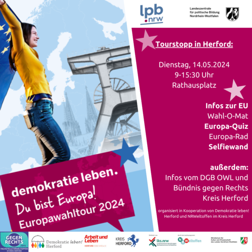 Am 14.05.2024 bieten die Fachstelle NRWeltoffen im Kreis Herford und die Koordinierungs- und Fachstelle Demokratie leben! Herford gemeinsam mit der Landeszentrale für politische Bildung NRW ein umfangreiches Informations- und Mitmachprogramm rund um die Europawahl am 9.6.2024 an.