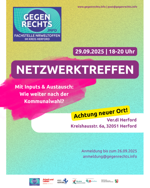Disclaimer: Die Terminrubrik ist eine Plattform für kreisweite Aktionen und Veranstaltungen zu den Themenbereichen Rassismus und Rechtsextremismus und ihren Facetten. Die Fachstelle NRWeltoffen stellt die Termine ein, ist jedoch nicht gleichzusetzen als Veranstalterin. Gern können wir auch zugesendete Termine einstellen unter post@gegenrechts.info